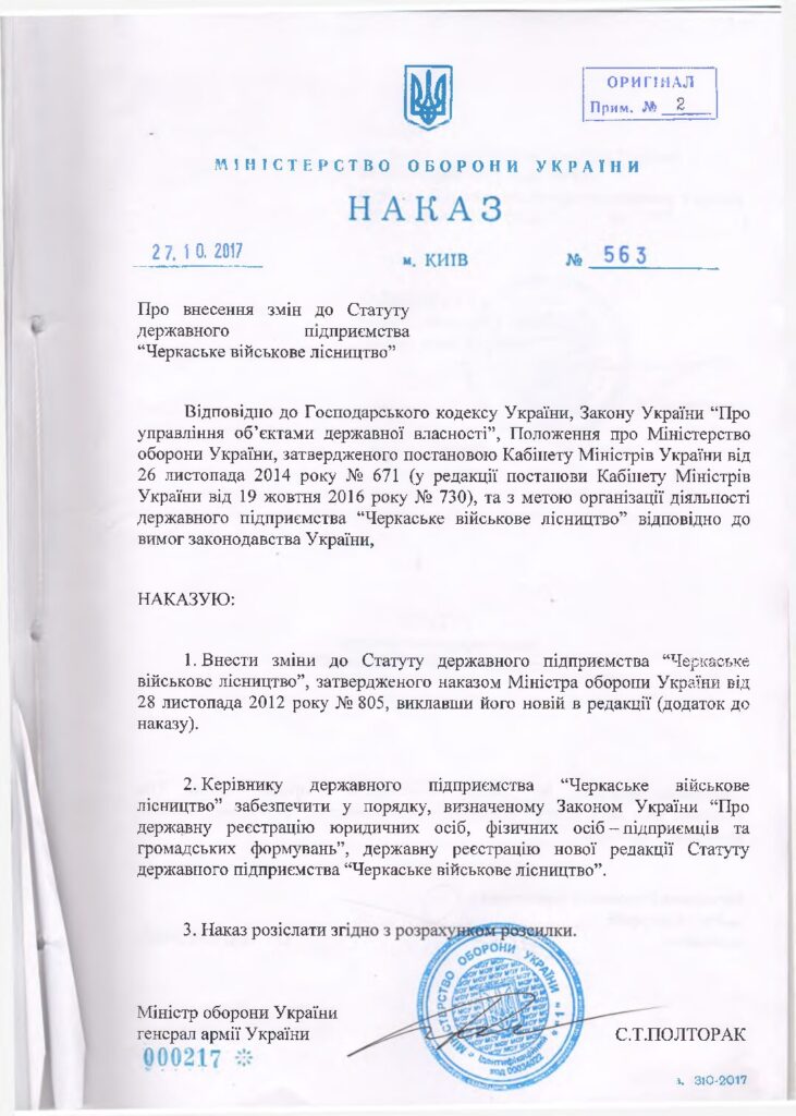 З 2017 року ДП “Черкаське військове лісництво” підпорядковується Головному управлінню майна та ресурсів Міністерства Оборони України.
